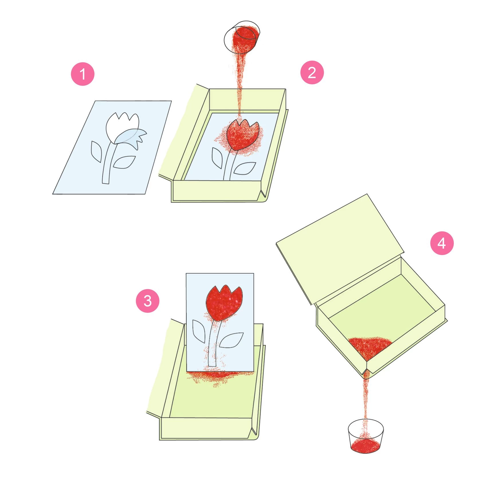 | Contenu du produit | 4 cartes illustrées et préencollées (15 x 21 cm), 9 pots de sables colorés, 2 tubes de paillettes, 1 outil plastique et 1 livret d’explications pas à pas en couleurs. |