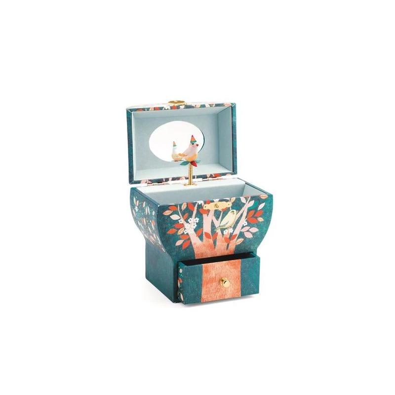 La boîte à musique est composée d’un tiroir et d’un grand coffre. Lorsque l’on ouvre la partie supérieure un petit oiseau dansera au rythme de la musique Santa Lucia.
