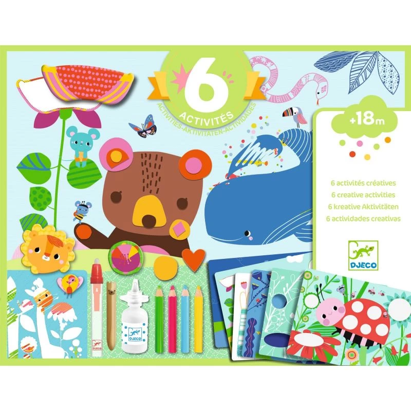 - 6 activités à découvrir : collage de carton, collage de feutrine, coloriage magique, coloriage à l’eau, carte à gratter, color stop.