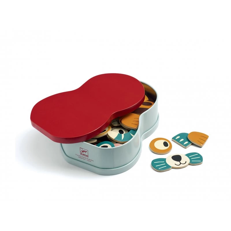 Connaissez vous le chaboux (moitié chat, moitié hiboux) ? Avec ce coffret Inzebox Animo de 82 magnets en bois vous pourrez laissez libre court à votre imagination et créer des animaux rigolos ou essayer de reconstituer de véritables animaux. La boîte métallique servira de support pour vos créations. Elle possède deux faces de couleurs différentes ce qui permettra de varier les créations. Et avec les 82 magnets en bois les possibilités seront très nombreuses