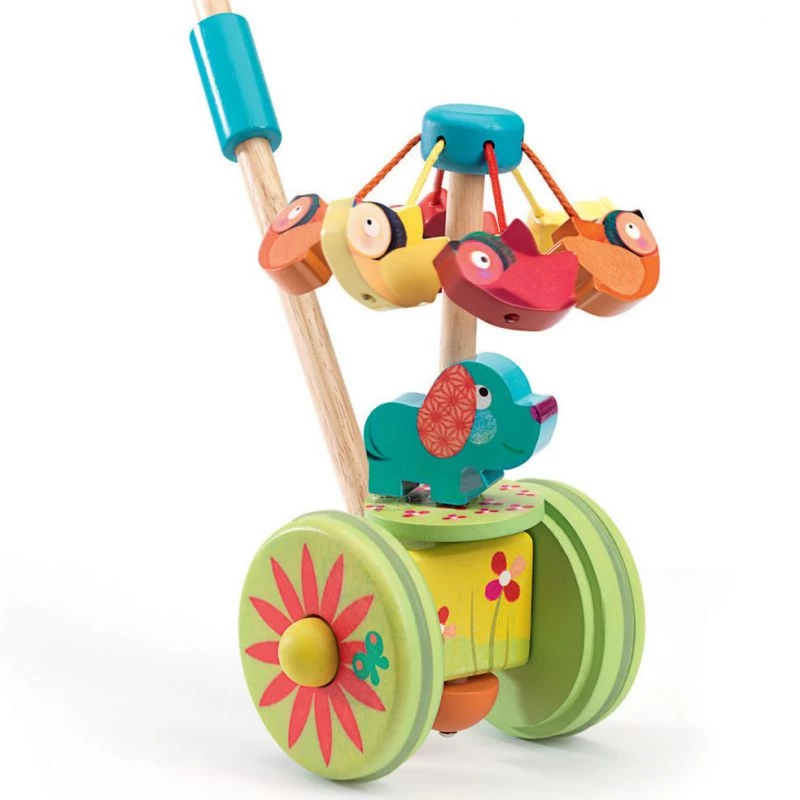 Rouli cuicui est un joli jouet à pousser de Djeco aux couleurs printanières. Il amusera votre enfant qui verra tournoyer les petits oiseaux lorsqu’il le fera rouler. Les roues sont cerclées de caoutchouc afin de protéger les parquets et de ne pas faire trop de bruit.