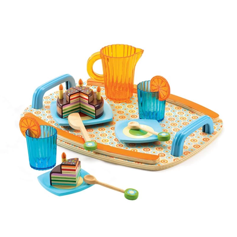 La dînette le goûter de Gaby est une dînette très colorée mélangeant bois et plastique dans un style très vintage. Elle comporte un gâteau pré coupé en 4 parts sur son plat, 1 couteau, 2 assiettes, 2 cuillères, 2 verres avec 2 rondelles d’orange, un pichet et bien sûr un plateau pour porter l’ensemble.