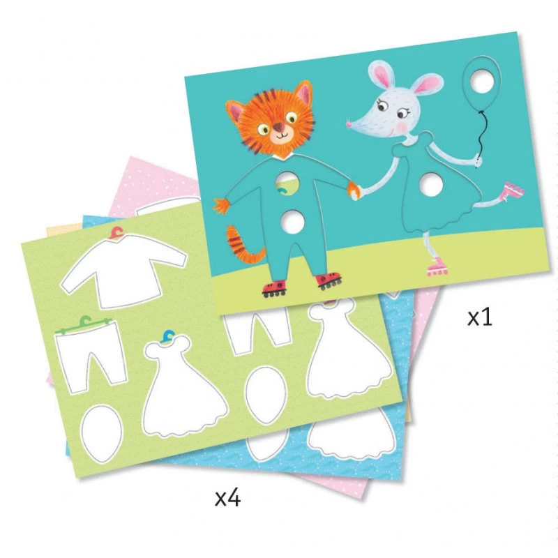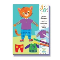 Ce coffret permet de créer soi même les habits avec lesquels on va jouer à habiller Elliot et Zoé. La création s’effectue sur des cartes épaisses pré découpées ce qui permet de ne pas se soucier des débordements. Le feutre magique associé aux 7 feutres de couleurs permet de réaliser très facilement des motifs sur les habits. Un coffret très simple d’utilisation pour un rendu qui épatera vos enfants.