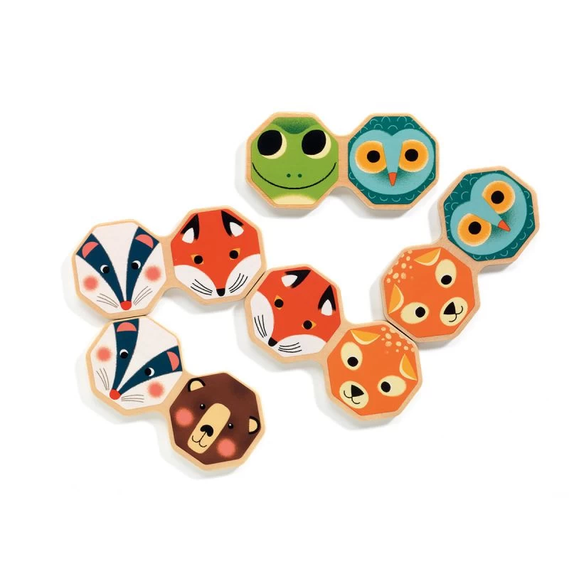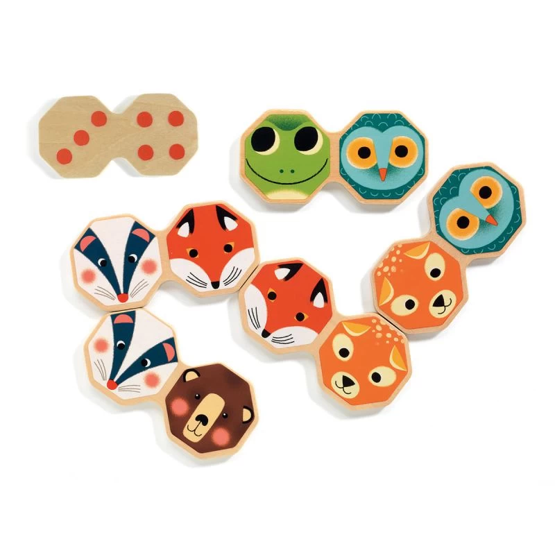 Octo domino est un jeu de dominos en bois pour les petits dès deux ans. Les dominos sont de forme octogonale et représentent des têtes d’animaux sur une face. Sur l’autre face, vous retrouverez les chiffres d’un jeu classique de domino.