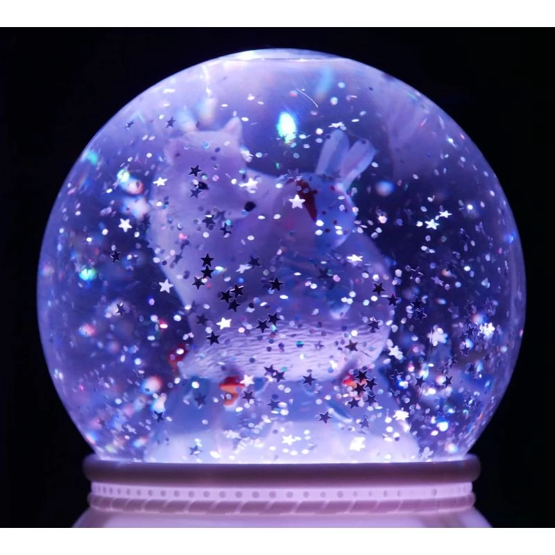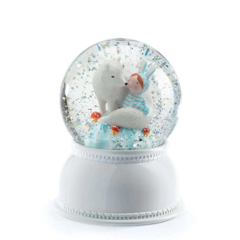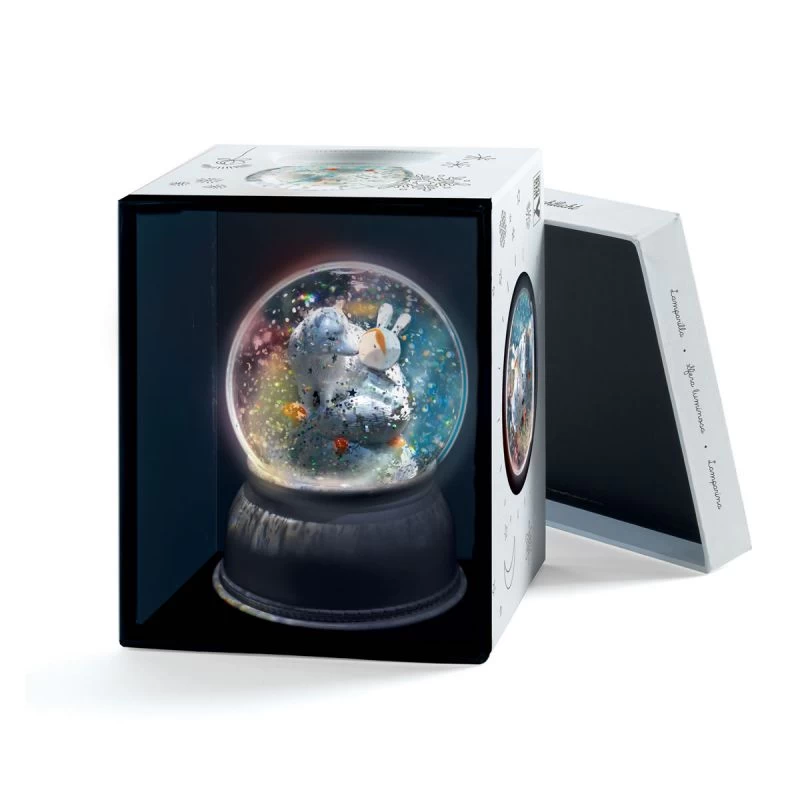Lila et Pupi est à la fois veilleuse et boule à neige. Cette veilleuse pour enfant ou bébé intègre un mécanisme qui en plus d’éclairer la boule avec différentes couleurs va faire tourbillonner les paillettes pour offrir un spectacle féerique d’une petite fille enlacée par une louve protectrice.