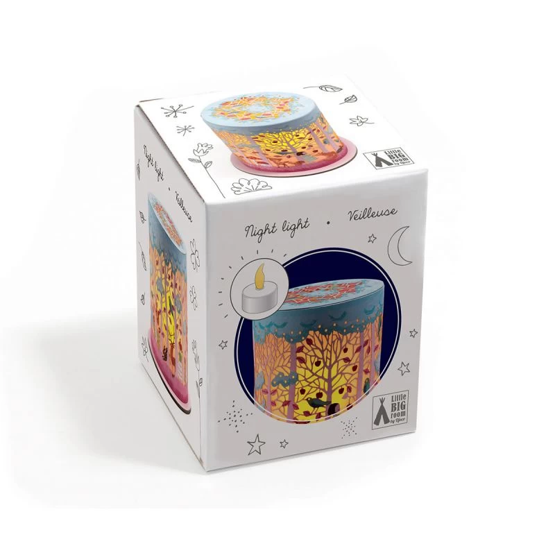 Cette veilleuse forêt magique diffuse une lumière douce au travers du papier ajouré faisant ressortir les dessins d’arbres et d’animaux de la forêt. La veilleuse dispose d’un timer qui permet de l’éteindre automatiquement au bout de 20 minutes.