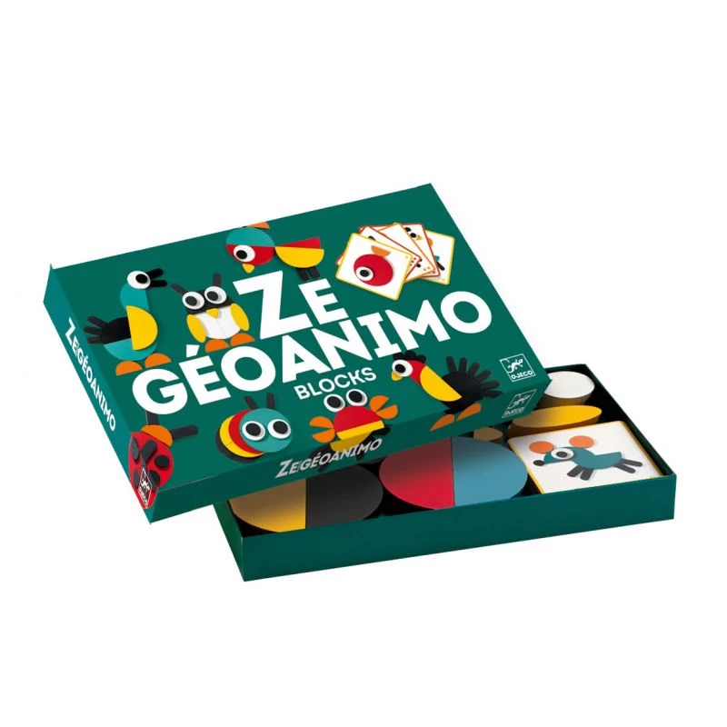 Ze Geoanimo est un jeu de formes et de couleurs de Djeco proposant aux enfants de créer des animaux en assemblant des formes géométriques basiques. Le jeu propose 20 cartes à reproduire réparties en 3 difficultés croissantes. Le jeu est composé de 30 pièces en bois.