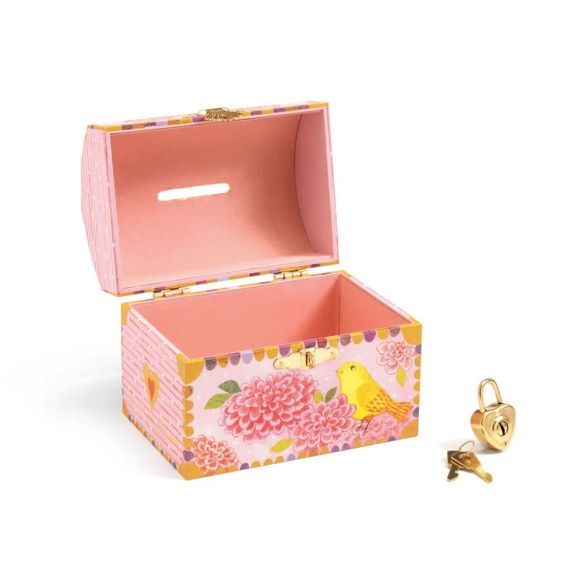 Cette charmante petite tirelire oiseaux permettra à votre petite fille de mettre ses économies de côté. Elle adorera glisser dans la fente les pièces et les billets et ouvrir son coffre à l’aide du cadenas en forme de coeur pour compter ses économies.